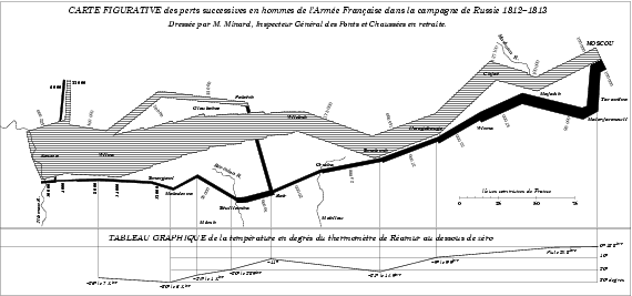 The figure above is a graphical representation of Napoleon Bonaparte's invasion of and subsequent retreat from Russia during 1812. The graph shows the size of the army, its location and the direction of its movement. The temperature during the retreat is drawn at the bottom of figure.