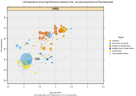 Two subsetting slots allow you to quickly detect trends or relationships between categories of a factor variable. Colour, sizing, and many other features, can be added through the Add to Plot interface.