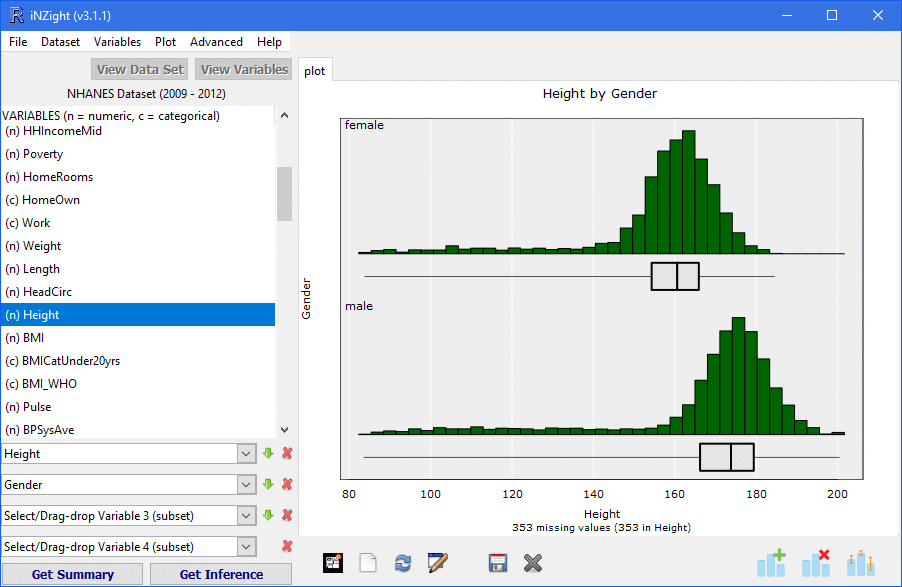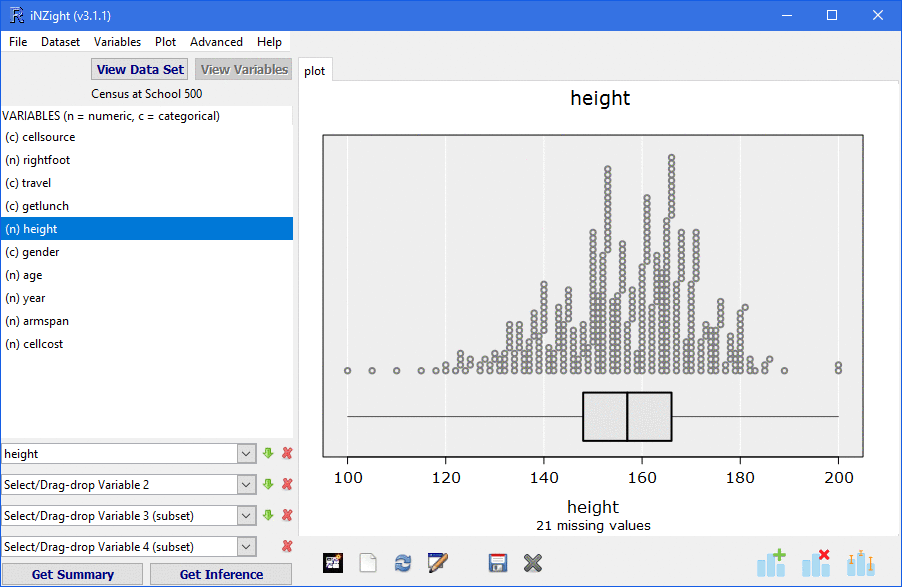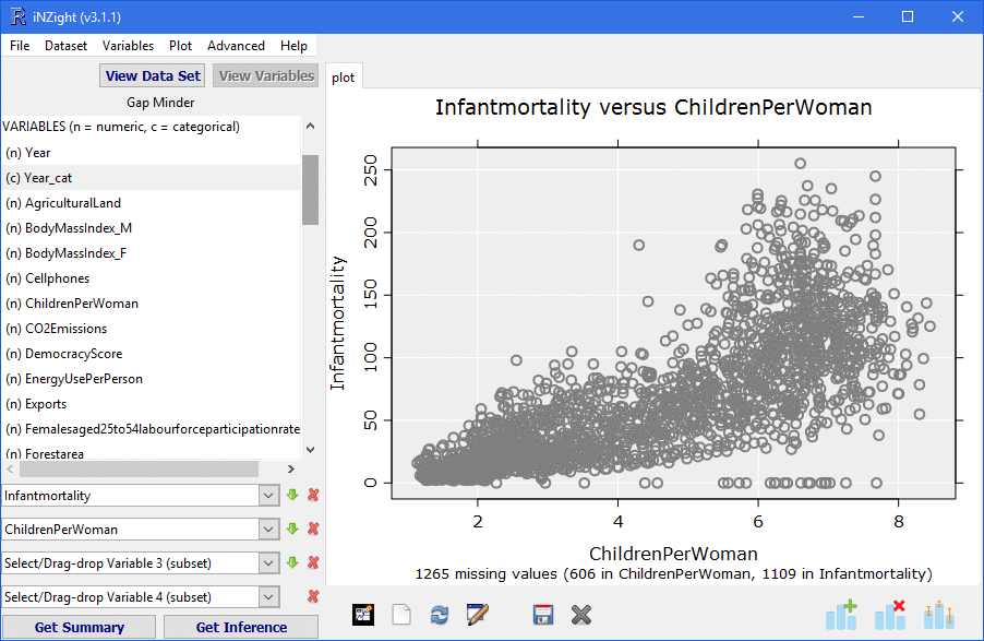As with the smart plots, the Get Summary and Get Inference buttons quickly provide numerical summaries relating to the displayed plot. Tables of counts for categorical data; means, medians and variance for numerical; and regression summaries for fitted trend lines.