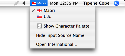 . - Now you have the input menu shown at the top right by your name. If you have multiple keyboards enabled - I only use the Māori keyboard - you may choose the Maori keyboard on the input menu.