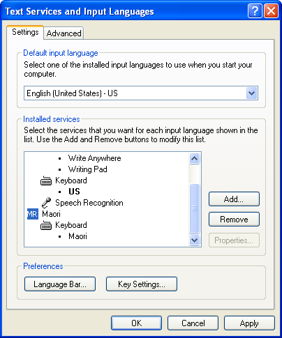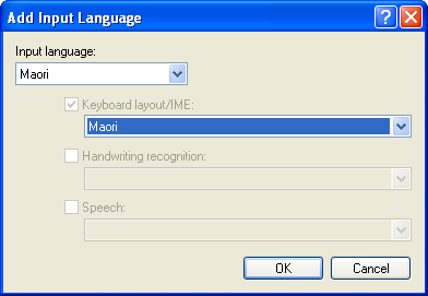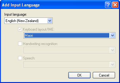 dropdown select Maori. (You can press M a few times to locate it.) Alternatively, and this may cause Microsoft Word's spellchecker a different amount of confusion, you can choose the language as English (New Zealand) and manually choose the Maori keyboard layout. - Here we can see the Maori language and Maori keyboard are available. You can set Maori to be the default keyboard rather than the English (United States) being the default if you want. Let's knock this on the head by clicking OK. Or click Apply then OK. Or click Apply then Cancel. Suit yourself.